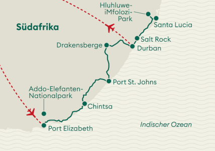 Erleben Sie eine abwechslungsreiche Reise: von spannenden Safaris im Addo Elephant Park und Hluhluwe iMfolozi Park, über die unberührten Strände der Wild Coast, bis hin zu den majestätischen Drakensbergen und der Küstenlandschaft von St Lucia.