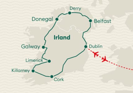 Entdecken Sie Irlands inspirierende Landschaften und lebendige Städte. Dublin mit seinen zahlreichen Pubs und die Cliffs of Moher sind nur zwei der Highlights, die es auf einer Reise durch die grüne Insel unbedingt zu entdecken gilt. Auf unserer Reise passieren Sie auch die Grenze zu Nordirland, welches Teil des Vereinigten Königreichs ist,  und fahren an die nördliche Antrimküste, wo Sie bei dem zum UNESCO-Welterbe gehörenden Giant’s Causeway einen Stopp einlegen.